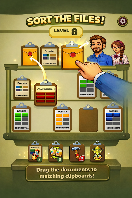 Les clients font la queue, chacun avec des dossiers différents. Votre mission : trier, associer et placer les bons dossiers rapidement avant la fin du temps imparti. Une seule erreur et c'est le chaos !