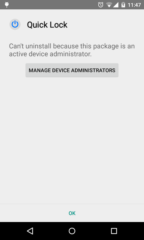 If you want to uninstall the application,please cancel the Quick Lock in "Settings -> Security -> Device administrators", then uninstall it as normal application.