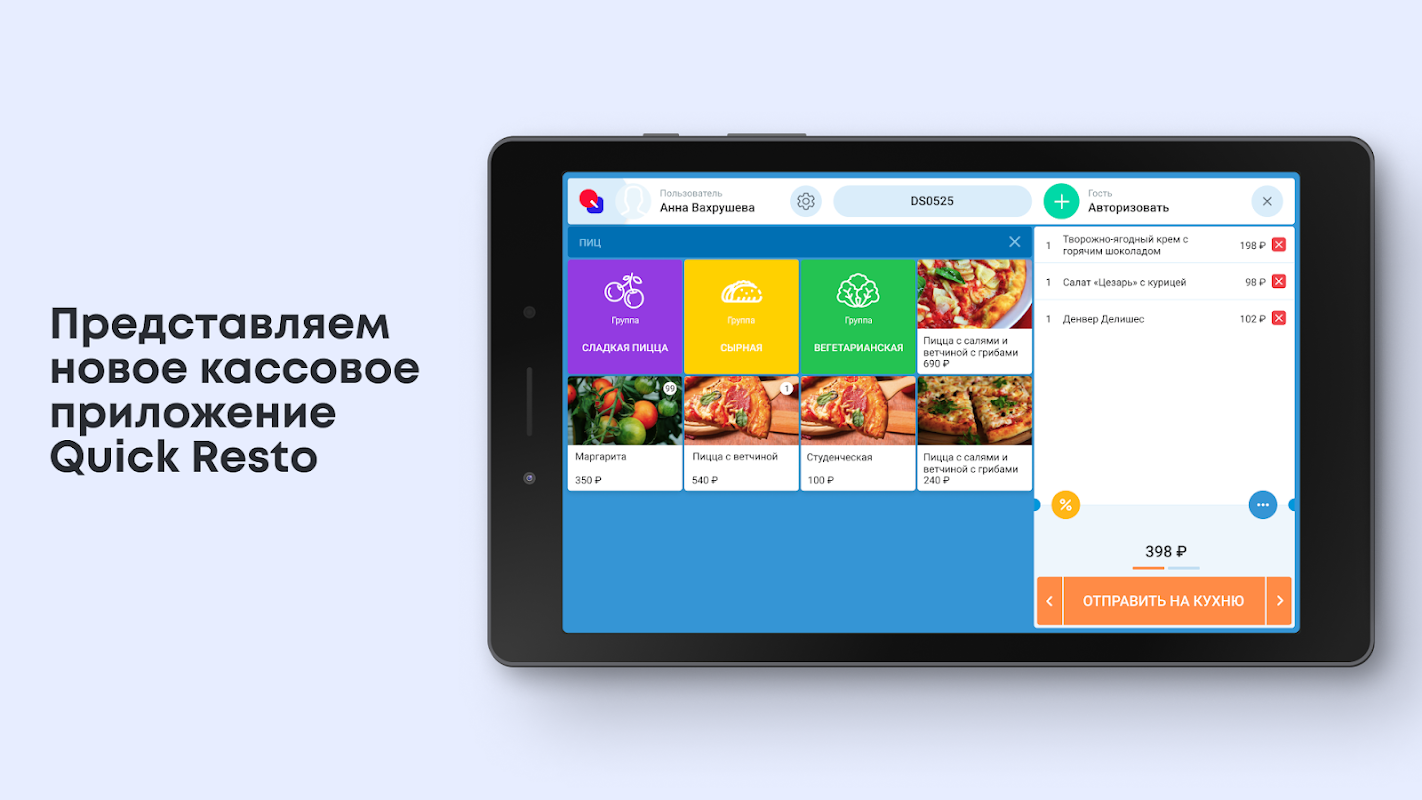 Le terminal de paiement fonctionne dans un système unique avec le back-office cloud Quick Resto. Adapté au 54-FZ et fait office de caisse enregistreuse en ligne.
