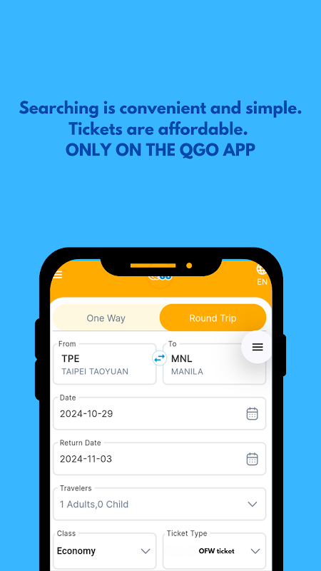 "Recherchez, réservez et partez. Réalisez votre voyage passionnant en trouvant des billets PRATIQUES, SIMPLES et BON MARCHÉ uniquement sur l'APPLICATION QGO !!