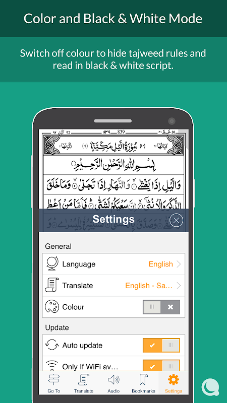 - Lire en couleur avec les règles de Tajweed ou de lire en noir et blanc