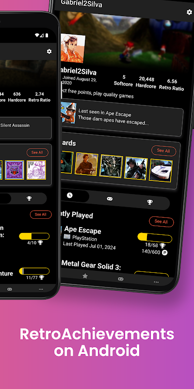RA Tracker pour RetroAchievements.org est une application native permettant aux utilisateurs d'afficher et de suivre leur compte RetroAchievements. RA Tracker possède de nombreuses fonctionnalités, toutes conçues pour maximiser l'expérience RetroAchievements et vous sentir comme chez vous sur votre appareil Android.