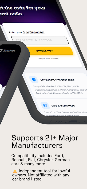 Service indépendant : Cette application est un outil de récupération indépendant développé par Car Radio Codes. Ce n'est PAS une application officielle d'un constructeur automobile.