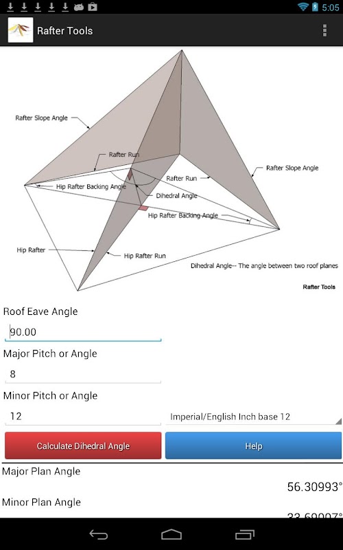 Rafter Tools est une application Android avec des fonctions pour calculer un calculateur d'angles de charpente de toit complexes.