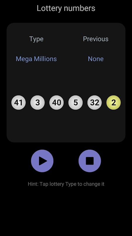 Vous pouvez choisir entre deux types de loterie : Powerball et Mega Millions. Appuyez sur Play et notre application générera les numéros pour vous (cinq boules blanches puis une sixième boule rouge et respectivement jaune).