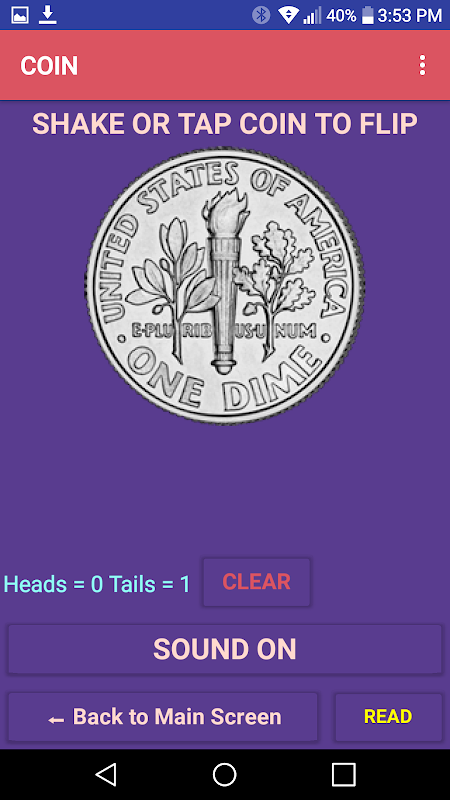 COIN animates a heads or talls toss. Sound on calls out the toss and simulates a coin rolling on a table. A counter keeps track of the number of heads and tails called.