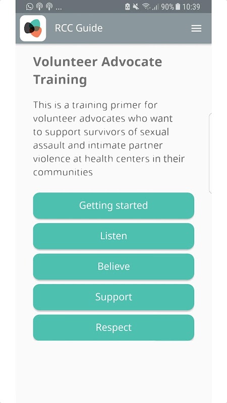 L'application contient une formation pour avocats bénévoles et est une amorce de base de l'information qu'un conseiller en crise de viol Etat certifié américain recevrait dans le cadre de la formation de 40 heures qui est généralement nécessaire avant qu'un conseiller peut faire du bénévolat dans les hôpitaux.