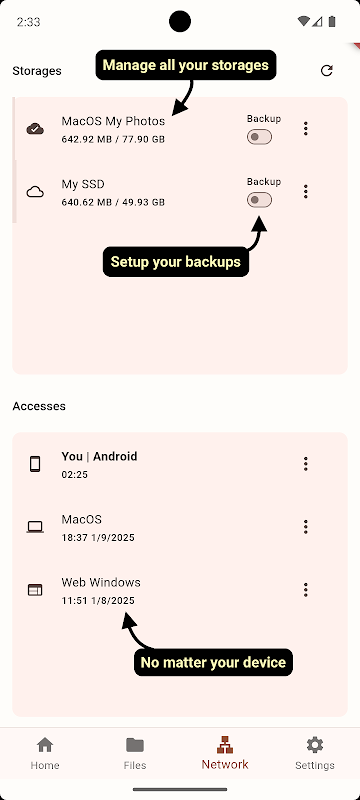 Créez facilement votre propre réseau de stockage en nuage sécurisé à l'aide de vos appareils. Évitez de payer des services de stockage coûteux qui ne respectent pas votre vie privée. Installation rapide et sans souci technique.