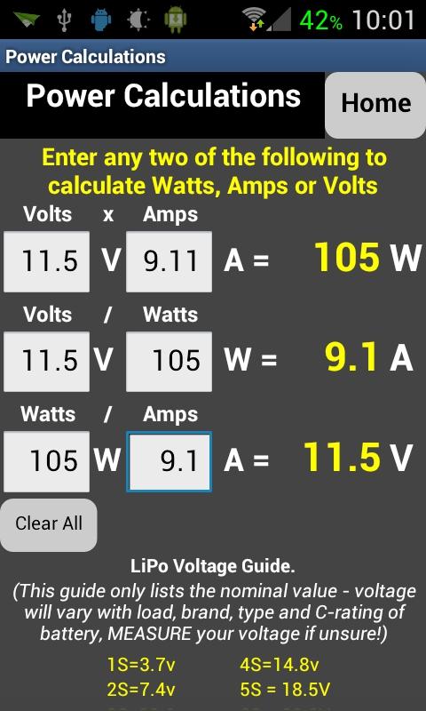 a) Si votre système utilise 16 ampères et une batterie 2200mAh 3 cellules, entrée 2200mAh et 16A dans l'application et il va calculer que vous devriez être en mesure de voler (au gaz COMPLET) pendant 6 minutes 36 secondes jusqu'à ce que la batterie est de 80% appauvri ou 8 minutes 15 secondes (également à gaz complète) jusqu'à ce qu'il soit 100% appauvri.