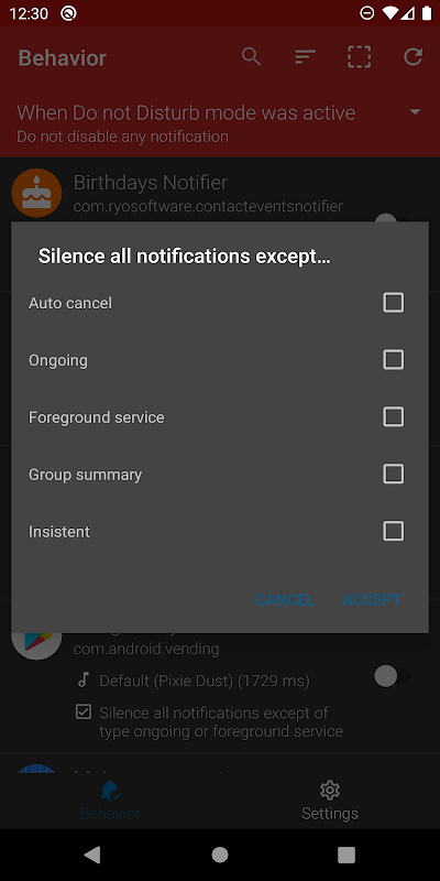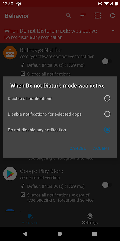 La solution que nous proposons, qui résout (partiellement) le problème, est de vous proposer de sélectionner les applications que vous souhaitez désactiver lorsque l'appareil est en "mode Ne pas déranger" et, pour chacune de ces applications, d'indiquer le son de notification qu'elles utilisent , ce qui nous permettra de calculer le temps approximatif dont nous disposons pour faire taire l'appareil afin d'éviter que la notification ne soit entendue.