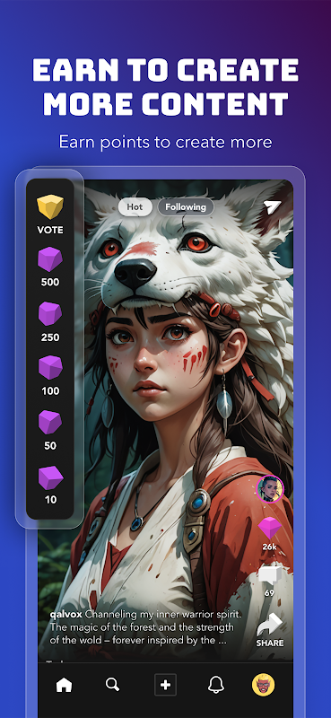 Publiez vos créations, gagnez des Pierres, des Gemmes et des Diamants auprès de la communauté, participez à des défis et concours de hashtags et invitez vos amis pour agrandir votre audience. Sur REBL, la créativité est valorisée, pas seulement appréciée.