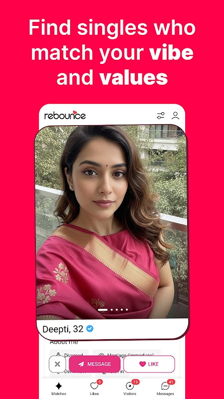 Application matrimoniale Rebounce : une application de rencontre exclusive, conçue pour les célibataires souhaitant se remarier. Elle offre un espace fiable aux personnes de toute l'Inde pour se connecter et trouver l'âme sœur. C'est donc l'application la plus classique pour les célibataires souhaitant se marier !