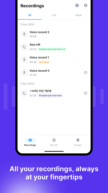 Rec-all vous permet d'enregistrer des appels, des voix et de partager des enregistrements.