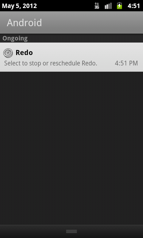 Redo est une application récurrente de définir des rappels répétés par bip ou des vibrations d'une durée de quelques secondes jusqu'à plusieurs heures. Un travail Rétablir fonctionne dans le fond de sorte que vous pouvez fermer l'application et obtenir encore notifié. Pour accéder à arrêter le travail, il suffit de sélectionner Rétablir dans la barre de notification et cliquez sur le bouton Stop à l'intérieur de l'app.