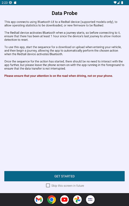 Utilisez Bluetooth LE pour vous connecter aux appareils Redtail Telematics, pour mettre à jour le micrologiciel et télécharger les données d'exploitation à des fins d'analyse.