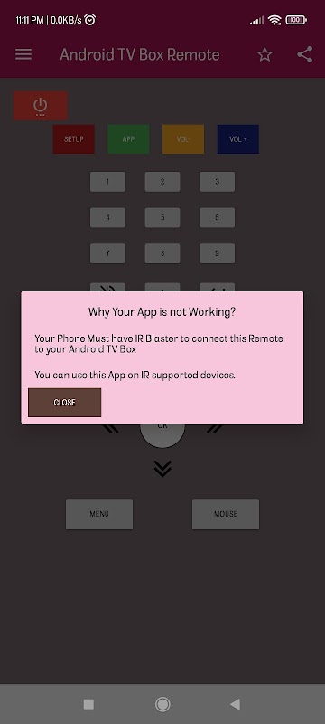 Remote Control for All Android Tv Boxes is the smart app to control all the functionality of your Android Tv box devices .This app provides all the functionalities that your physical remote provides and other advanced functions as well. This App will help you alot if your physical remote is damage or lost. This Apps works on all android tv boxes without programming . This App is fully depend upon IR Blaster to respond with tv box so Your smart phone muswt contain IR sensor, else this App will not works .