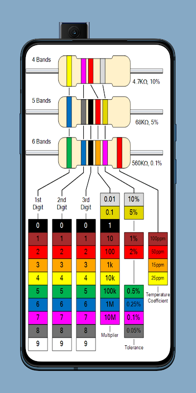 L'application de code de couleur de résistance aide à calculer la valeur de la résistance en utilisant la couleur