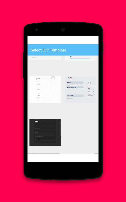 This application contains Different CV examples templates. User can create multiple resumes. The best part is the user did not need to convert the CV into PDF or Doc file. User can send the desired CV to anyone from inside the app. Just Tap the share icon and send it.