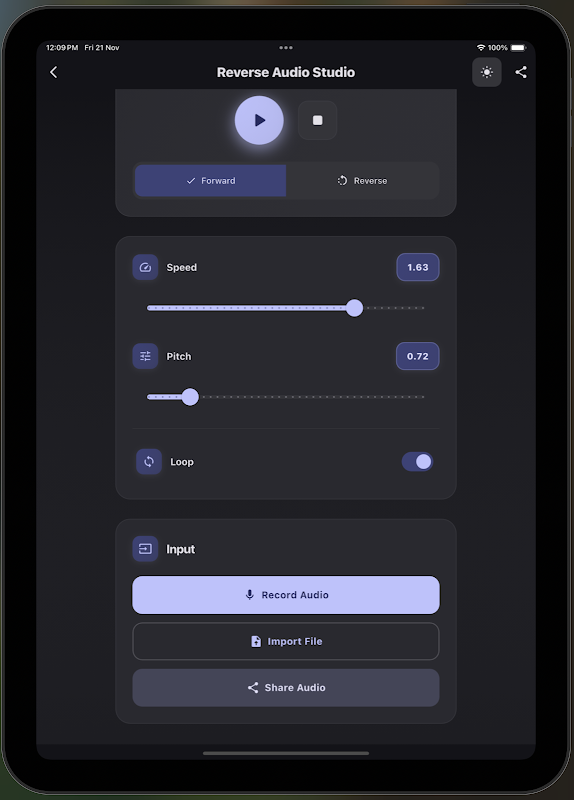 Exportez et partagez votre audio traité directement depuis l'application. Envoyez votre audio inversé ou modifié à vos amis, publiez-le sur les réseaux sociaux ou enregistrez-le dans vos applications préférées.