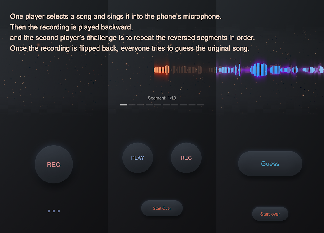 Plongez dans un univers musical unique avec notre nouveau jeu ! Ce jeu musical amusant, palpitant et entièrement gratuit vous apportera une joie immense, à vous et à vos amis. Un joueur sélectionne une chanson et la chante dans le micro de son téléphone. L'enregistrement est ensuite lu à l'envers, et le deuxième joueur doit répéter les segments inversés dans l'ordre. Une fois l'enregistrement inversé, chacun essaie de deviner la chanson originale.