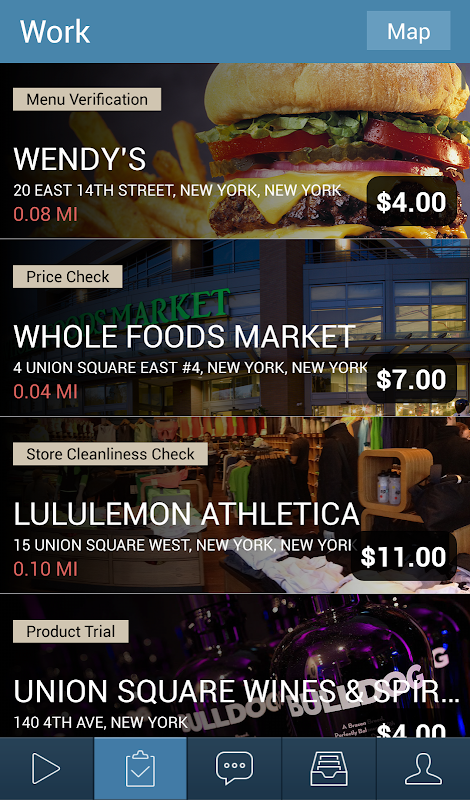 You earn money for collecting data and providing insights on products, services and store conditions. Do as few or many tasks as you'd like. Successfully completing tasks builds your status resulting in access to more and higher paying tasks.