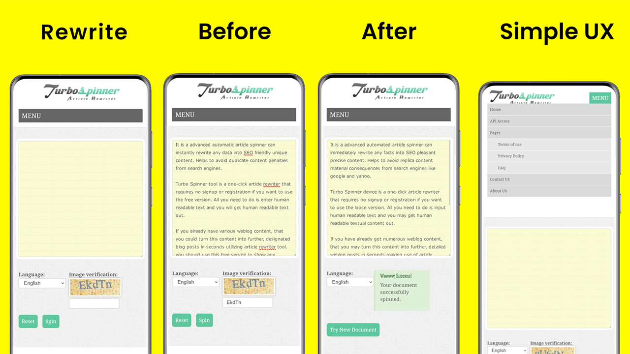 Outil professionnel de filage et de réécriture d'articles. Il est utilisé pour créer un contenu unique. Soumettez votre article et cette application transformera votre article en un article unique. Article Spinner and Rewrite fournit un article unique sans changer le sens de l'article soumis. Les articles Spin ou Réécrits contiennent différents ensembles de mots qui représentent le même sens. L'article réécrit est également bien formaté. Cela le rend adapté à un usage professionnel.
