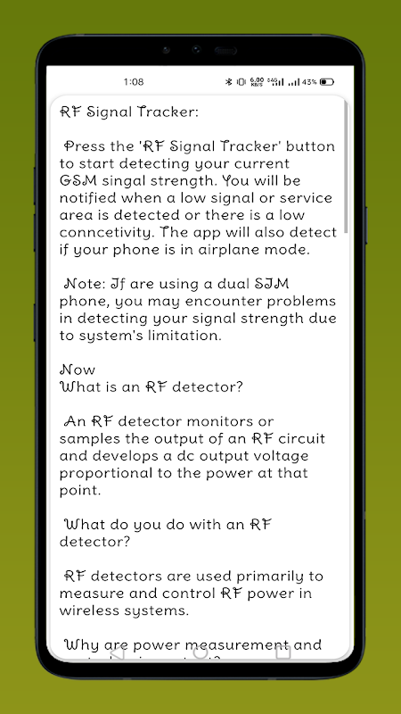 L'application RF Signal Tracker vous aide à effectuer des tests de conduite impromptus avec votre téléphone Android. Avec l'application RF Signal Tracker - RF Signal Detector, vous pouvez surveiller la force du signal RF et WiFi tel que vu par l'appareil ainsi que les hotspots WiFi. Détecteur de signal RF RF Signal Tracker Net Speed est une application gratuite de téléchargement d'application et de suivi de vos signaux RF. Le détecteur de signal RF et le traqueur de signal RF Wifi détectent la portée du signal par mètre et sont utilisés pour détecter le signal de radiofréquence. L'effet créé par cette application est capable de renforcer et de stabiliser votre connexion Internet.
