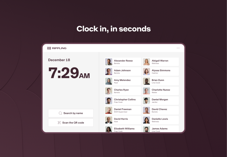 L'application Rippling Timeclock permet aux employés de pointer, de prendre des pauses, de modifier leurs horaires et bien plus encore, le tout depuis un seul appareil partagé.
