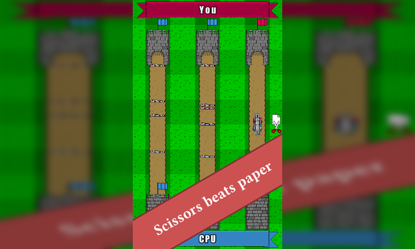 Battez-vous contre le CPU ou d'autres joueurs en ligne et essayez de capturer leurs châteaux. Chaque château a 3 chevaliers qui peuvent être équipés de pierre, de papier ou de ciseaux. Choisissez vos armes et envoyez vos soldats pour déjouer votre adversaire et capturer son château !