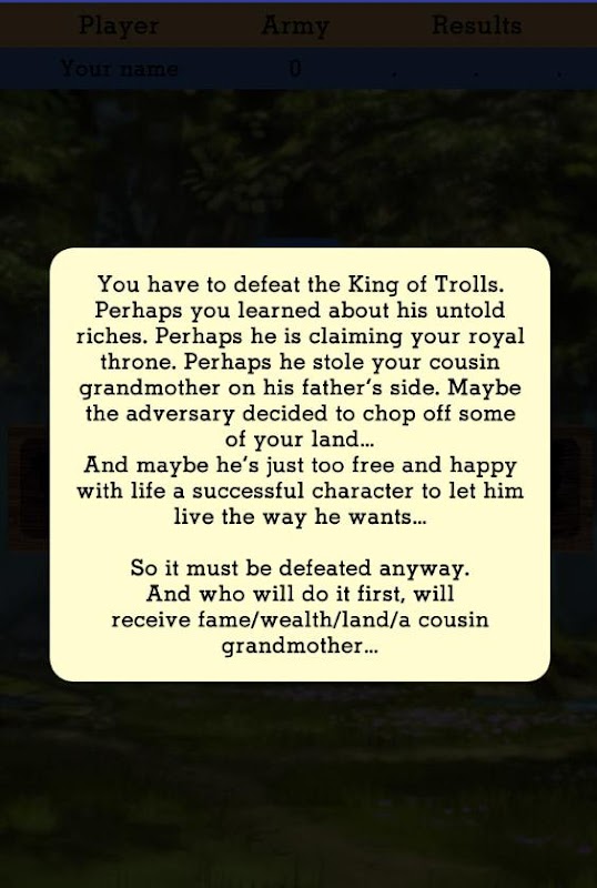 "Тысяча на костях" - фэнтэзи-игра, в которой вы сразитесь с непобедимым Королем Троллей. Соберите свою армию и бросьте ему вызов!
