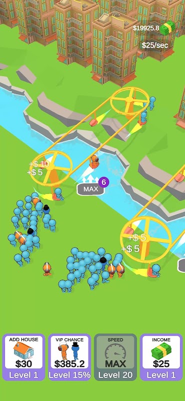 Construisez des plates-formes de téléphérique pour transporter des personnes, achetez et fusionnez des maisons pour attirer plus de clients, achetez plus de sièges, investissez dans des entreprises qui vous accordent un revenu passif. Avancez à travers de nouveaux et différents niveaux. Beaucoup de choses à faire dans ce jeu de fusion inactif satisfaisant !
