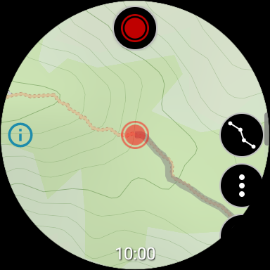 La version Wear OS prend également en charge le dessin d'itinéraire, le calcul de la longueur/gain/perte de l'itinéraire, l'estimation du temps, le positionnement GPS, la boussole, l'enregistrement de suivi, l'alerte d'écart, les cartes hors ligne, etc., avec une utilisation légèrement différente. Toutes les fonctions fonctionnent sans connexion téléphonique, à l'exception du transfert d'itinéraire.