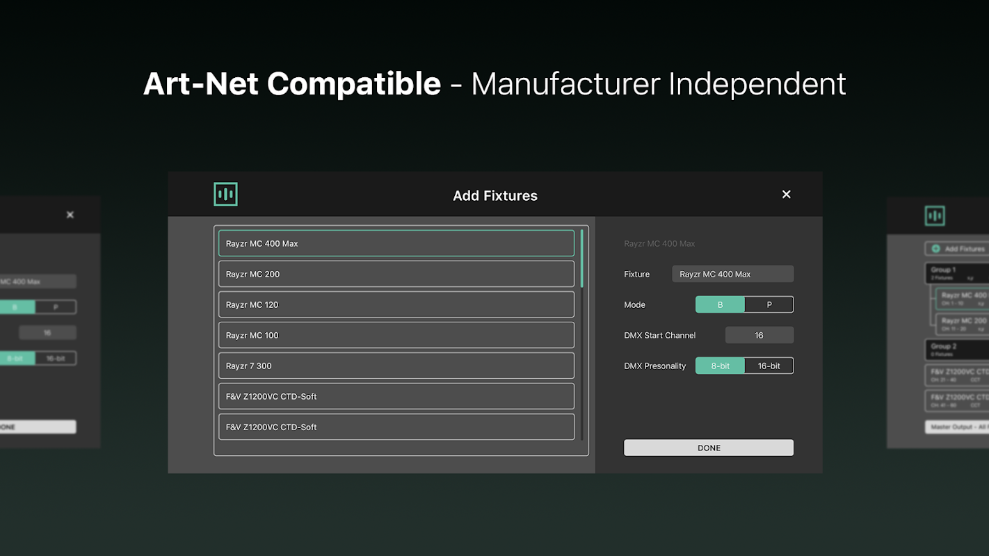 RTX Master vous permet de contrôler les luminaires compatibles Art-Net de divers fabricants tels que Rayzr, Vibesta, F&V via le routeur RTX ou tout autre appareil compatible Art-Net.