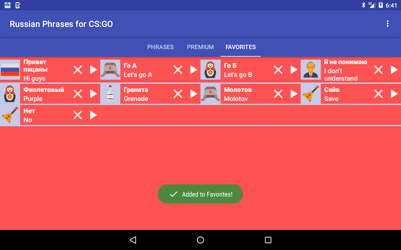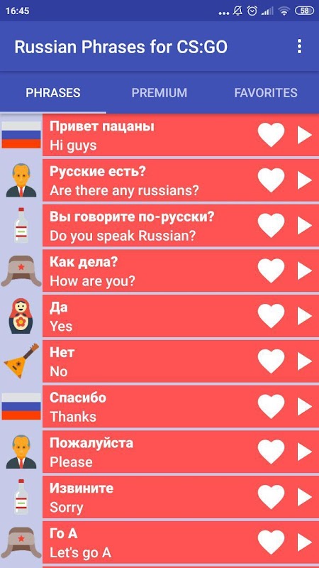 Chaque phrase de la table d'harmonie est traduite en anglais, vous n'avez donc plus besoin de vous demander ce que ces joueurs russes veulent dire lorsqu'ils utilisent des phrases courantes. Ces phrases ont été sélectionnées comme les plus utilisées dans le jeu CS: GO par les joueurs russes. Accédez rapidement à vos phrases les plus utilisées en les ajoutant à la liste des favoris. Débloquez des expressions encore plus étonnantes en achetant le package premium.