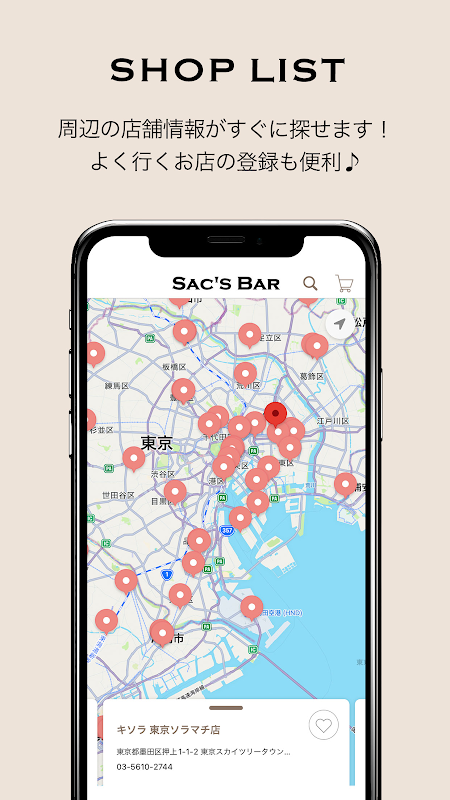 Vous pouvez consulter les dernières informations sur les produits et les campagnes avantageuses à tout moment, n'importe où, et s'il y a un produit qui vous intéresse, vous pouvez immédiatement rechercher des magasins à proximité avec GPS. C'est une application pleine du charme de SAC'S BAR.