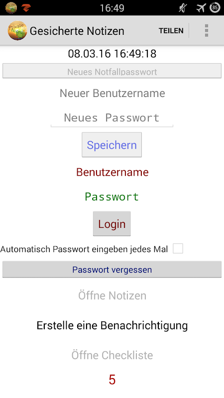 Mit dieser App können Sie Ihre Notizen speichern, gesichert mit einem von Ihnen festgelegtem Passwort und Benutzernamen. Wenn Sie Ihr Passwort vergessen haben sollten, können Sie sich davor noch ein 'Notfallpasswort' festlegen. Sie beinhaltet außerdem noch eine Checkliste, was manchmal sehr praktisch sein kann. Außerdem kann man mithilfe von Gesicherte Notizen eine Benachrichtigung mit Ihrem Titel und Ihrer Nachricht erstellen.