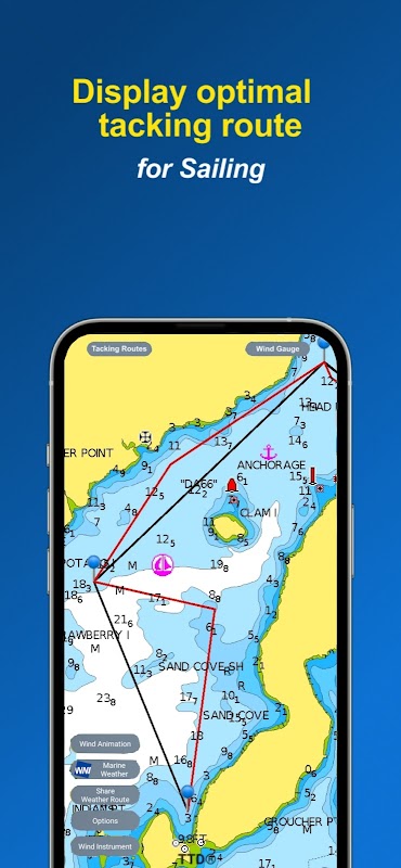 ● Si vous avez connecté l'anémomètre sans fil SailTimer Wind Instrument™ (www.SailTimerWind.com) à votre téléphone ou tablette, vos virements de bord optimaux seront automatiquement mis à jour dans cette application en fonction du vent. Vous pouvez également saisir manuellement la direction et la force du vent pour afficher les virements de bord optimaux pour l'itinéraire que vous planifiez.