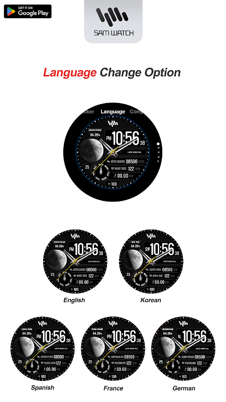 *Les applications pour smartphone sont des applications supplémentaires qui prennent en charge le téléchargement d'applications sur les appareils Watchface. Elle peut être différente de la capture d'écran du cadran de l'application pour smartphone et de la capture d'écran du cadran réellement téléchargée. La plupart des produits d'application Watchface de SamWatch incluent des applications pour smartphones.
