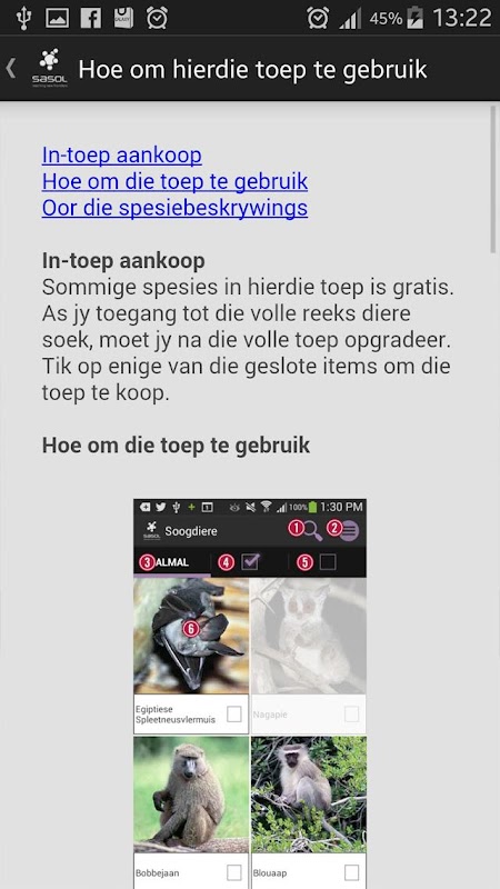 Die TOEP est Hoogs geskik vir débutants Sowel que besoekers aan die streek. Dit sluit en foto pragtige de la diereroepe, de la vidéo, kaarte en maklik leesbare teks plancher Suider-Afrika soi natuurlewe (insluitend mourir bewaringstatus van elke spesie).