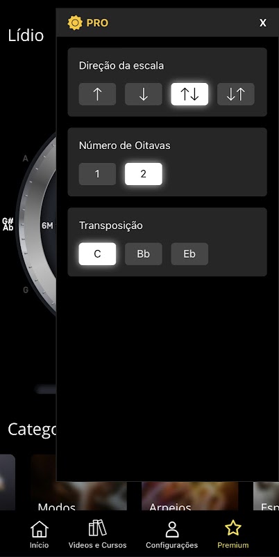 Dans ScaleClock, l'utilisateur sélectionne la gamme qu'il souhaite étudier dans une bibliothèque super complète et à travers l'interface créée par João Bouhid, il peut facilement changer les fondamentaux de cette gamme et pratiquer avec la lecture offerte par l'APP.