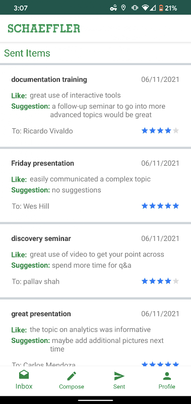 The intended audience of this app are Schaeffler Group employees to provide constructive feedback for specific events, meetings and workshops . The participants/Organizers will receive this feedbacks privately (one-to-one) with the purpose of enhancing their skills.