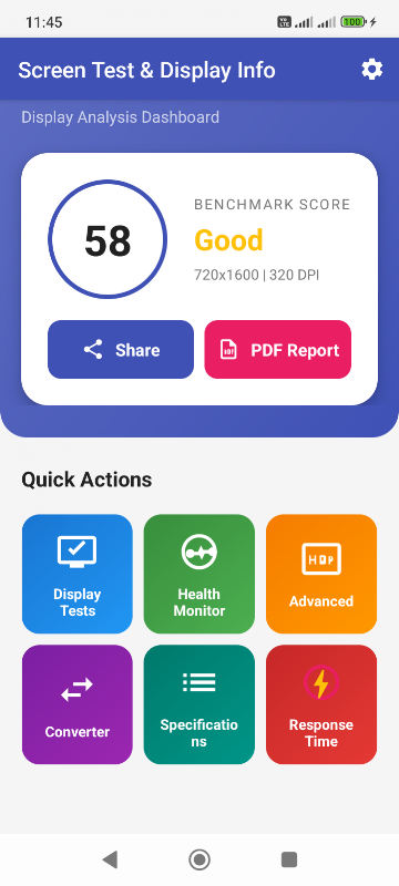 Screen Test & Display Info est l'outil idéal pour tester et analyser l'écran de votre smartphone ou tablette. Que vous achetiez un téléphone d'occasion, recherchiez des défauts d'écran ou souhaitiez simplement connaître les spécifications de votre écran, cette application répond à tous vos besoins.