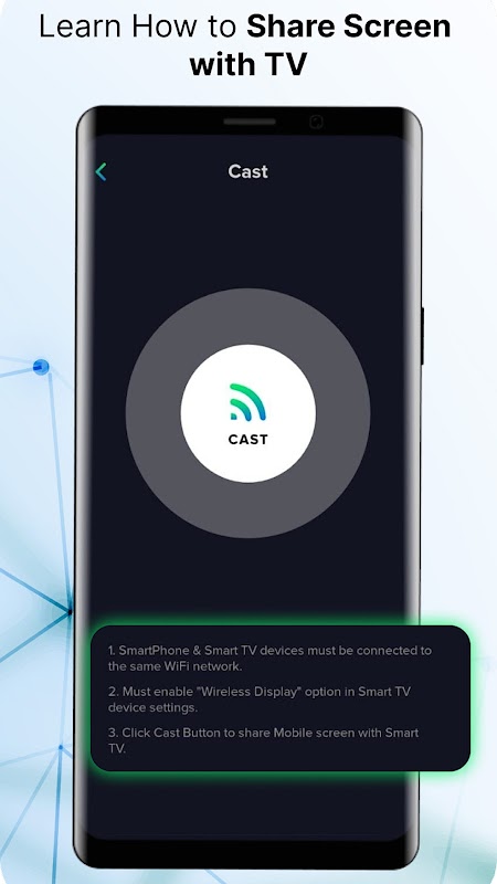 Le partage d'écran avec l'application smart tv vous aidera à mettre en miroir votre téléphone mobile avec la smart TV via le même réseau Wifi. Application de partage d'écran capable de lire des vidéos, de la musique et des photos, etc. L'application de partage d'écran vous permet de parcourir votre téléviseur en direct préféré. Découvrez et lancez vos films, émissions, sports, musique ou jeux sans interrompre votre expérience de visionnage à la télévision. L'application de partage d'écran peut être connectée au téléviseur intelligent lorsque les deux appareils sont connectés au même réseau.