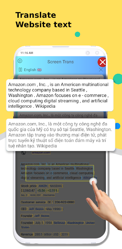 Screen Translator est une application de traduction d'écran intelligente avec une interface simple, précise, facile à utiliser et rapide. Attirez des milliers d'utilisateurs avec des traducteurs dans plus de 89 langues différentes. Aidez les utilisateurs à traduire n'importe quel texte à l'écran à tout moment, n'importe où, même lorsque vous surfez sur le Web ou jouez à des jeux.