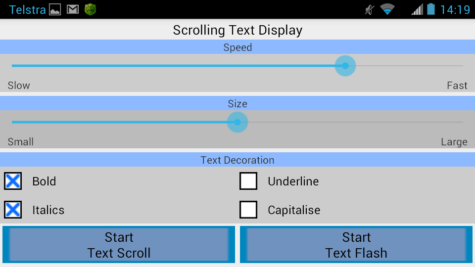 La taille et la vitesse du texte peuvent être facilement changés. Vous pouvez avoir des tailles de texte variant de très petite à très grande (qui prend la plupart de l'écran). Le grand texte est idéal à utiliser lorsque vous souhaitez afficher le message à quelqu'un qui est loin. De plus, le texte peut être défilé / s'affiche très lentement ou très rapidement.