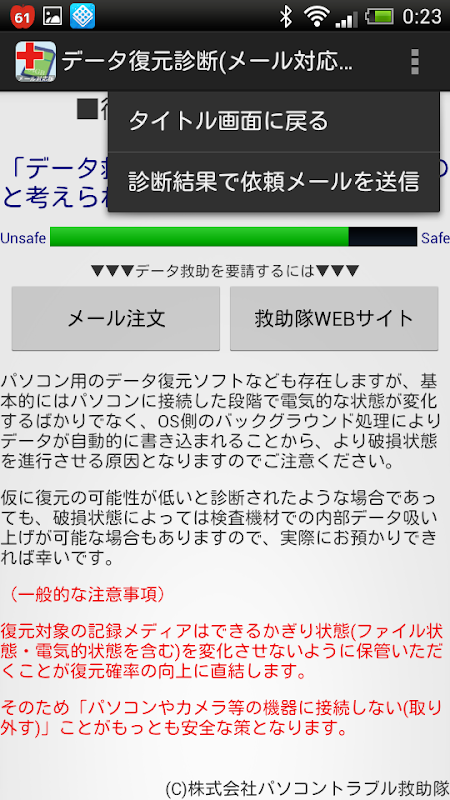 すでに公開済みの「データ復元診断」アプリと同じ判定内容ですが、診断結果のメール送信機能などを追加しており、簡単に有料の復旧サービスをご注文いただくことができます。