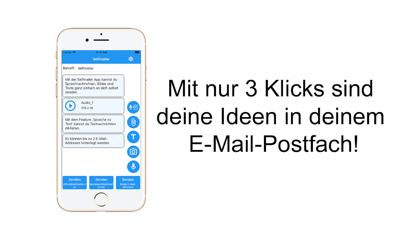 Mit der Selfmailer App kannst du Notizen, Memos, Sprachnachrichten und Bilder an dich selbst senden.