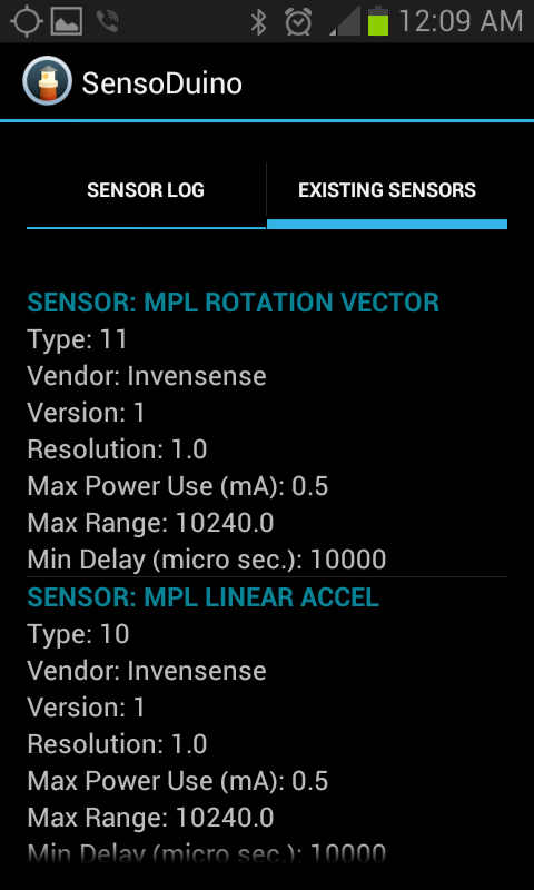 SensoDuino dispose également d'un capteur scanneur Android qui liste capteurs matériels et logiciels pris en charge par votre appareil Android ainsi que des spécifications de capteurs clés tels que max consommation d'énergie, la résolution, fournisseur, etc.
