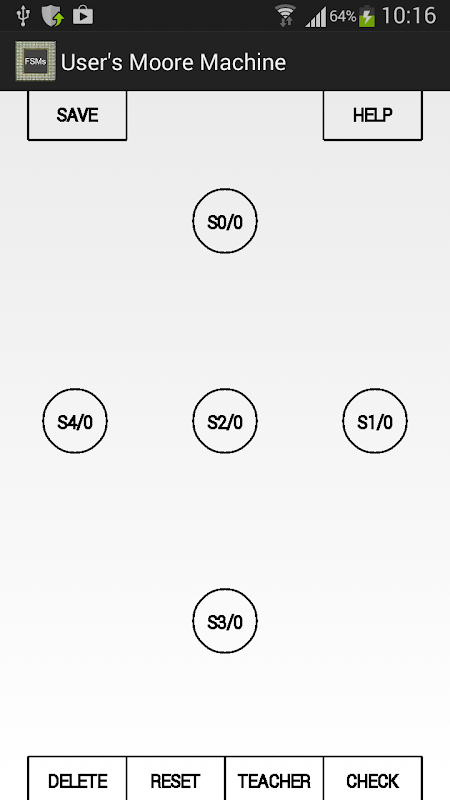 L'utilisateur peut sauvegarder des solutions d'exercices et de les envoyer par email, de sorte que le récepteur peut les charger dans l'application "combinatoire Circtuits". Est également inclus un tutoriel machines Moore et un manuel de base (aide) pour utiliser cette application.