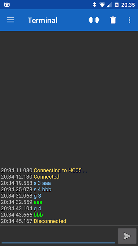 'Serial Bluetooth Terminal' est une application de terminal / console orientée ligne pour les microcontrôleurs, les arduinos et autres appareils dotés d'une interface série / UART connectée avec un convertisseur Bluetooth à série à votre appareil Android.